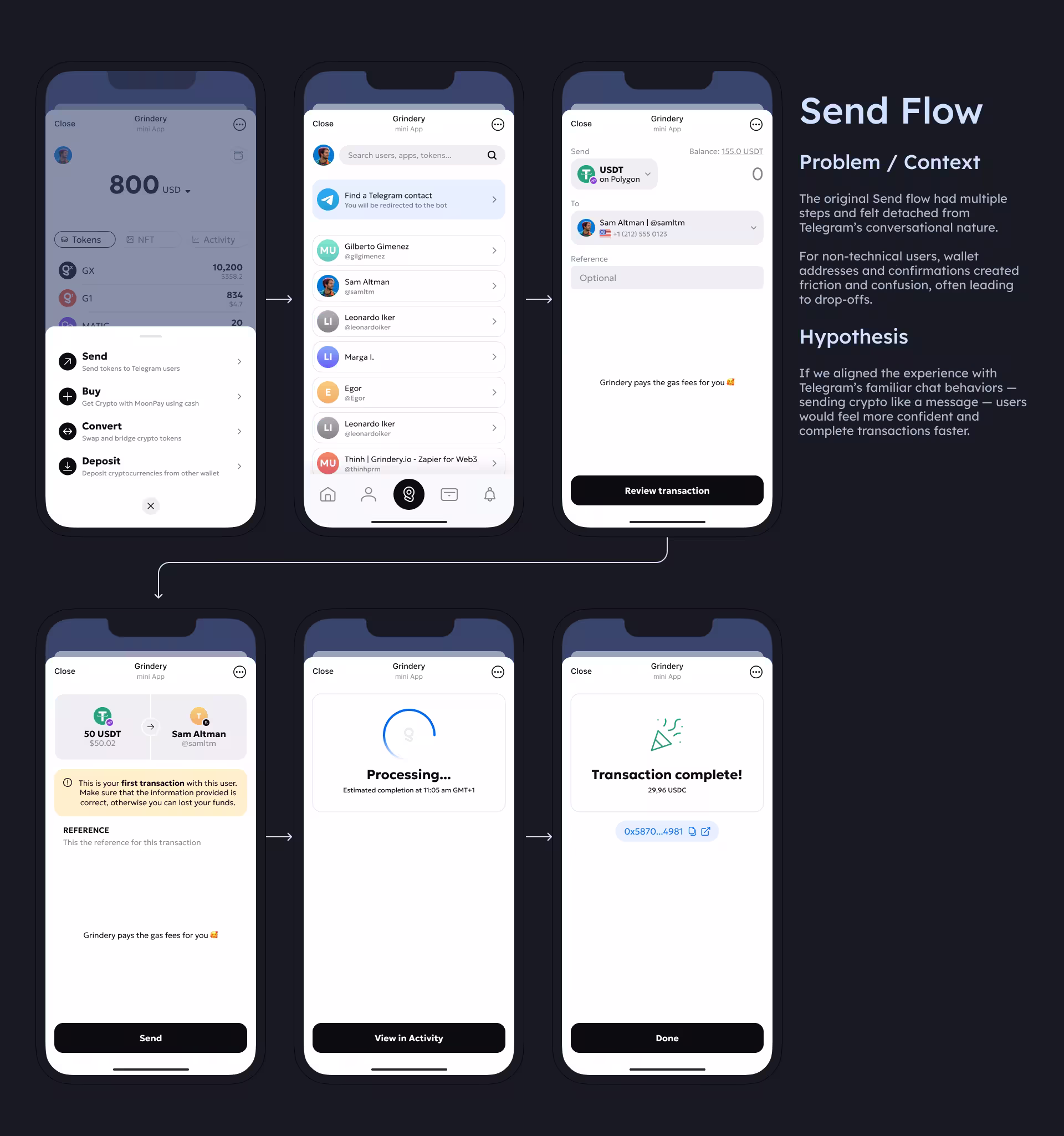 Result: The new design reduced transaction time by over 50% and boosted engagement among non-technical users, transforming Grindery Smart Wallet into one of Telegram’s most intuitive Web3 apps.